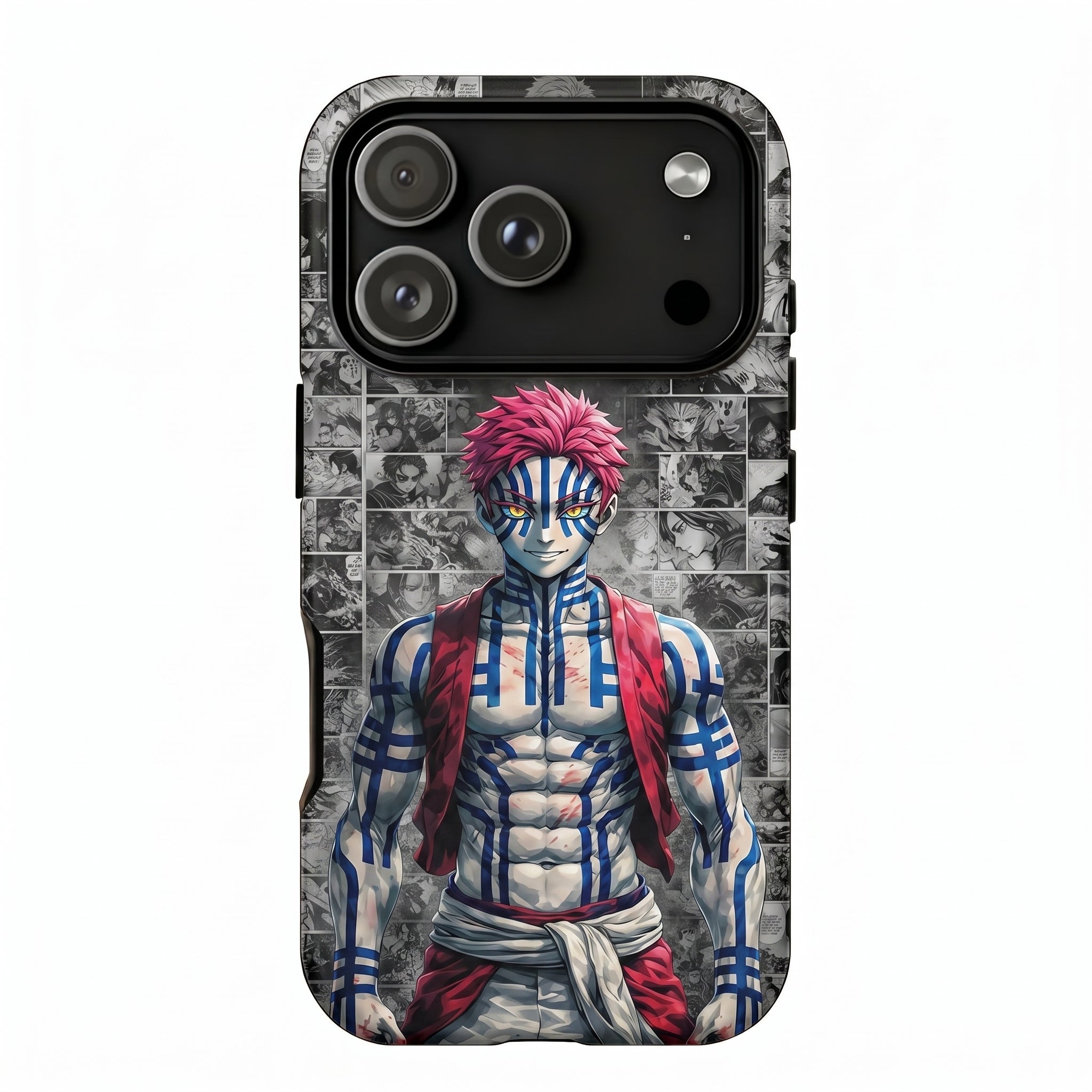 Upgrade your phone with this anime inspired Phone case featuring Akaza standing tall and confident with his iconic blue geometric body markings and vivid pink hair set against a detailed black and white manga panel collage wall background. The bold color contrast between the vibrant character and the monochrome manga panels creates a luxury editorial anime style that stands out instantly. Perfect for fans who love powerful demon warrior energy, bold artwork, and statement accessories.