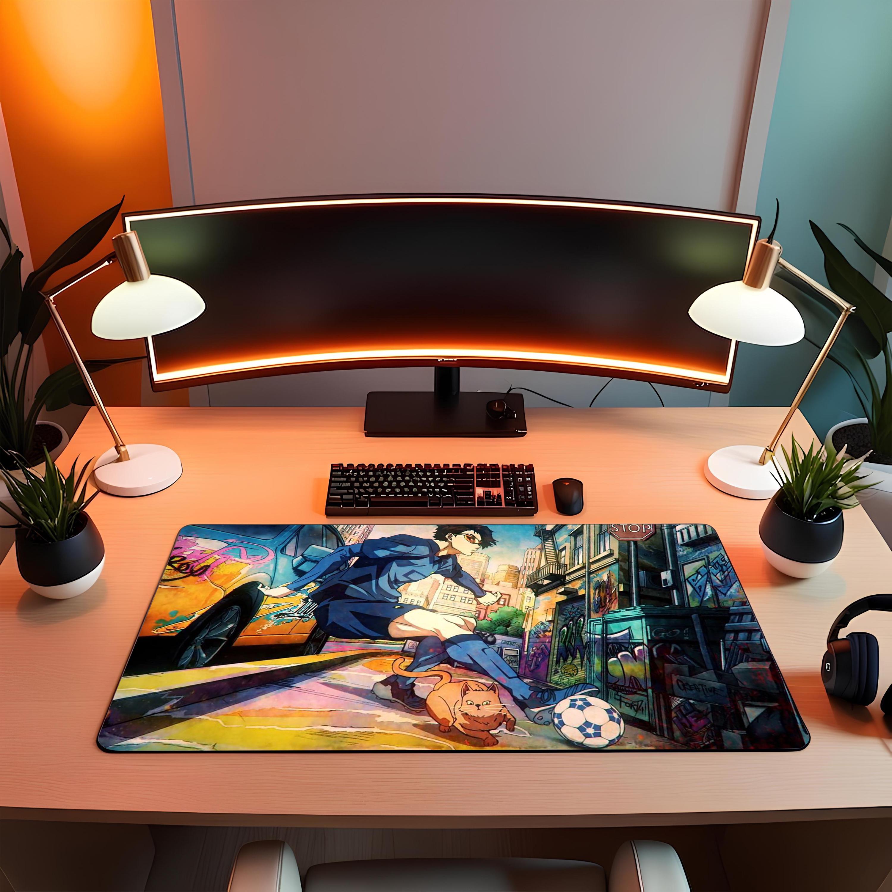 Upgrade your gaming setup with this Blue Lock anime inspired desk mat featuring the Blue Lock striker in a cool relaxed pose leaning against a yellow car with a soccer ball in motion set against a vibrant colorful city street background filled with graffiti murals neon lights and an adorable cat mascot. The lively urban composition, electric blue and warm golden tones, and street culture energy create a bold and stylish anime desk setup that stands out instantly. Perfect for fans who love intense soccer rivalry energy, bold artwork, and statement gaming accessories.